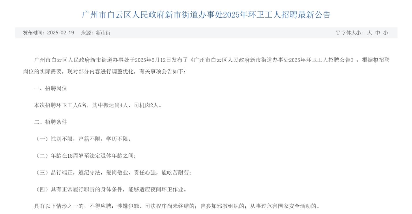 广州市白云区人民政府新市街道办事处于2025年2月12日发布了《广州市白云区人民政府新市街道办事处2025年环卫工人招聘公告》,根据拟招聘岗位的实际需要,现对部分内容进行调整优化,有关事项公告如下: